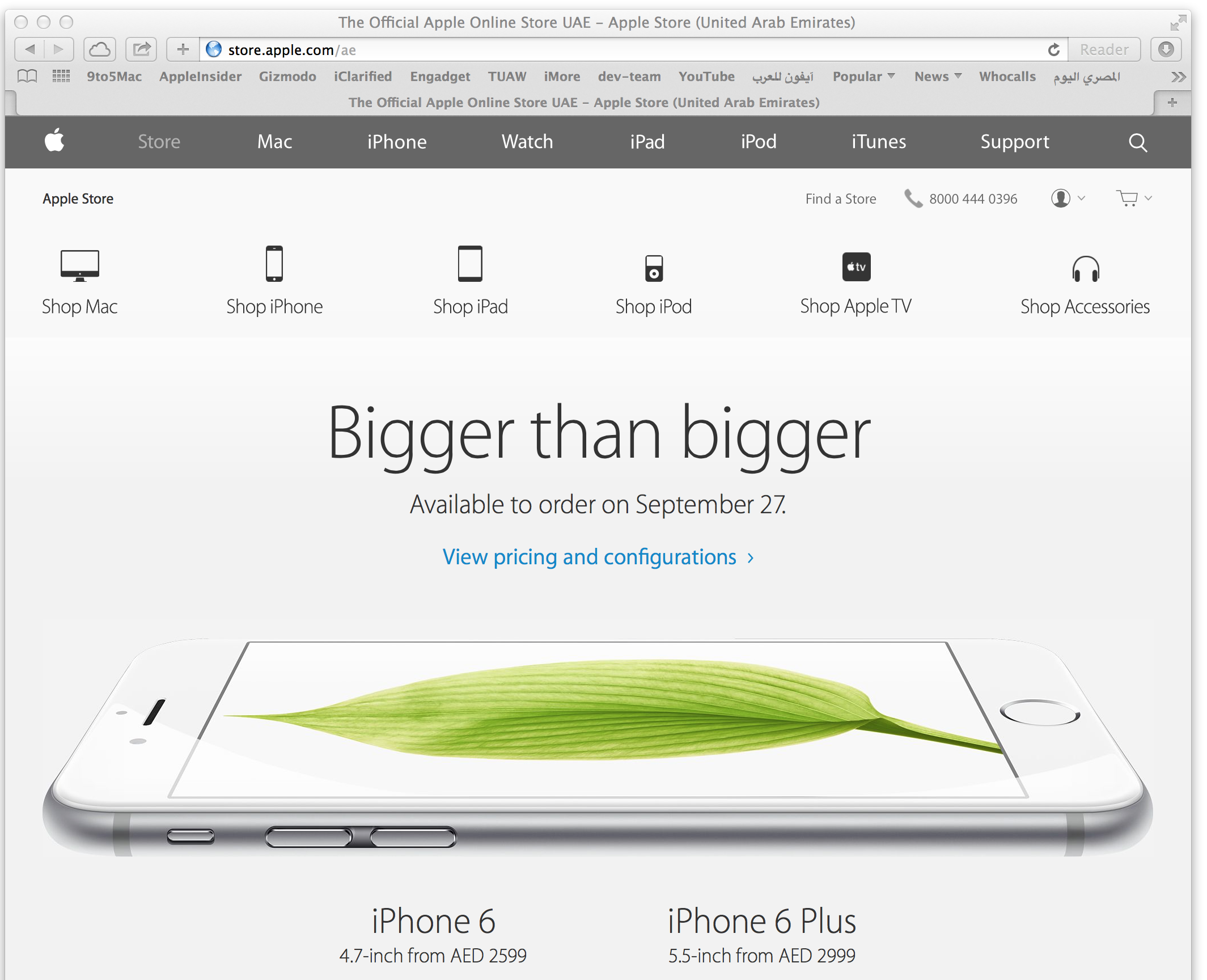 وأيضا يمكن رؤية موعد طرح آيفون 6 وأسعاره عبر المتجر الإلكتروني الخاص بالإمارات العربية المتحدة لشركة أبل: